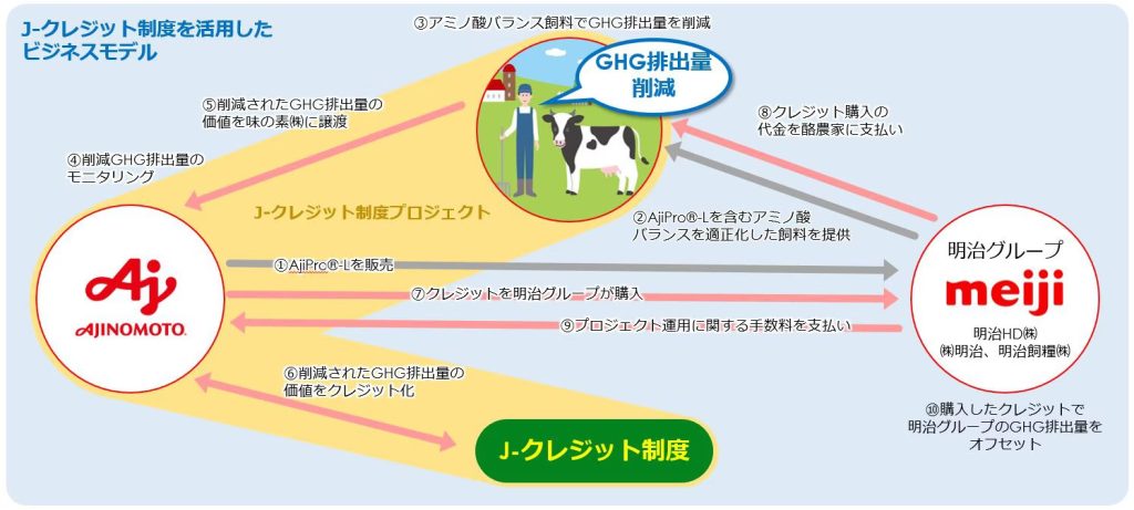 そこで、明治では「実データに基づく牛乳のカーボンフットプリント算定」「味の素株式会社と協業しアミノ酸バランス改善飼料により糞尿から発生する一酸化二窒素削減の推進と、J-クレジットを活用したビジネスモデルの運用」の2つの取り組みを開始しました。