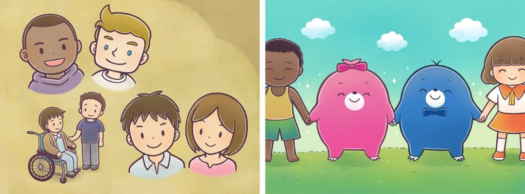 今回のテーマは『平等』です。SDGs17のゴールのうち「5. ジェンダー平等を実現しよう」「10. 人や国の不平等をなくそう」「16. 平和と公正をすべての人に」の3つに共通する大切なテーマです。人種や性別、障害など関係なく、世界中の全ての人が平等に暮らせるようになるにはどうすればよいのか、そのために自分たちに何が出来るのかを考えるきっかけになる絵本です。今作も、案内役であるもぐらのココちゃんとアスキくんが、子どもたちと同じ目線に立って、分かりやすくナビゲートします。
