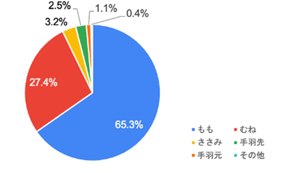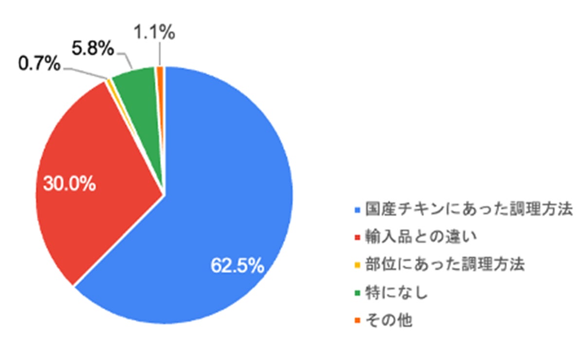 意識調査の結果、小学生の子どもを持つ保護者の9割以上が鶏肉購入時に「国産」を意識しており、6割以上が「国産チキンにあった調理方法」を、3割が「輸入品との違い」などの情報を求めていることが分かりました。また、鶏肉の最も食べる部位については6割以上が「もも」、また、鶏肉でよくする調理法については7割以上が「焼き物」であることも分かりました。