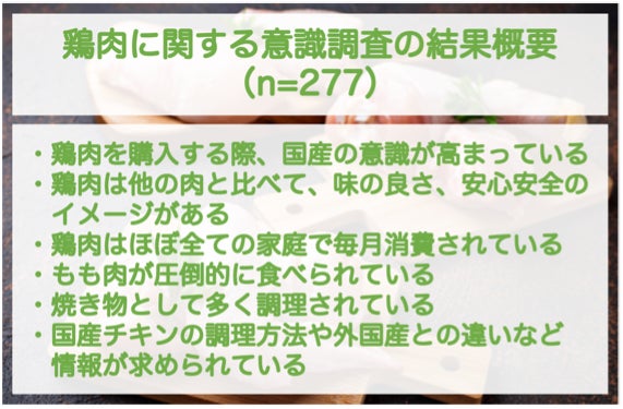 そのような背景のもと、今回、一般消費者側であるイノビオットと生産側である日本食鳥協会が共同で、小学生の子どもを持つ保護者277名に鶏肉に関する意識調査を実施しました。