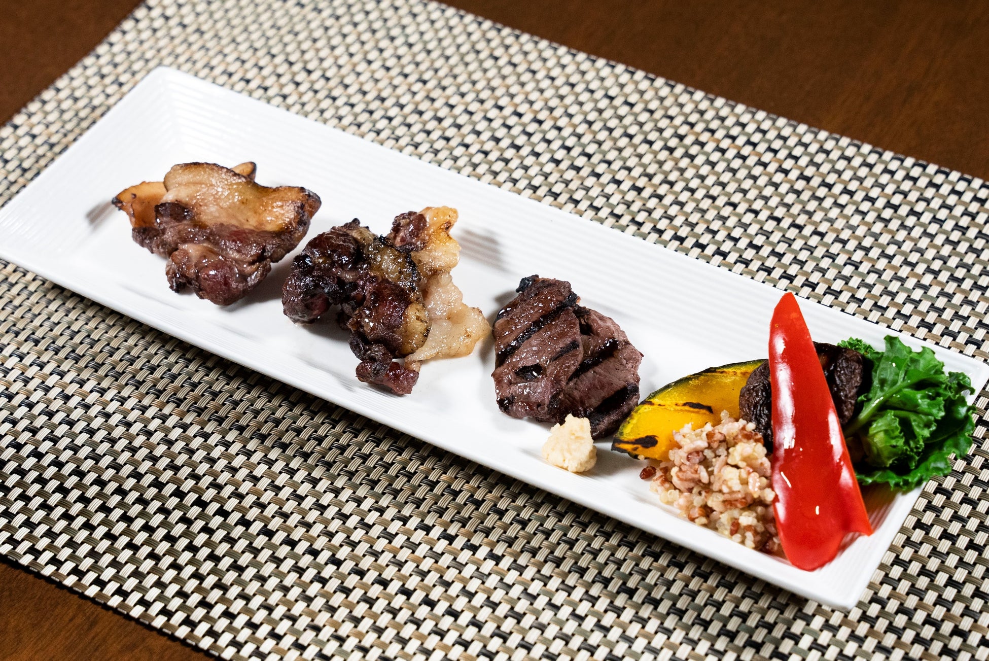 ジビエ肉3種 赤米とキヌアのライスサラダ添え、みそ煮込みジビエうどん、ジビエの筑前煮、ジビエの肉味噌、野菜のピクルス、ローズマリー風味のあまおう塩、赤ワインのバルサミコ酢、燻製醤油、レホール、白米