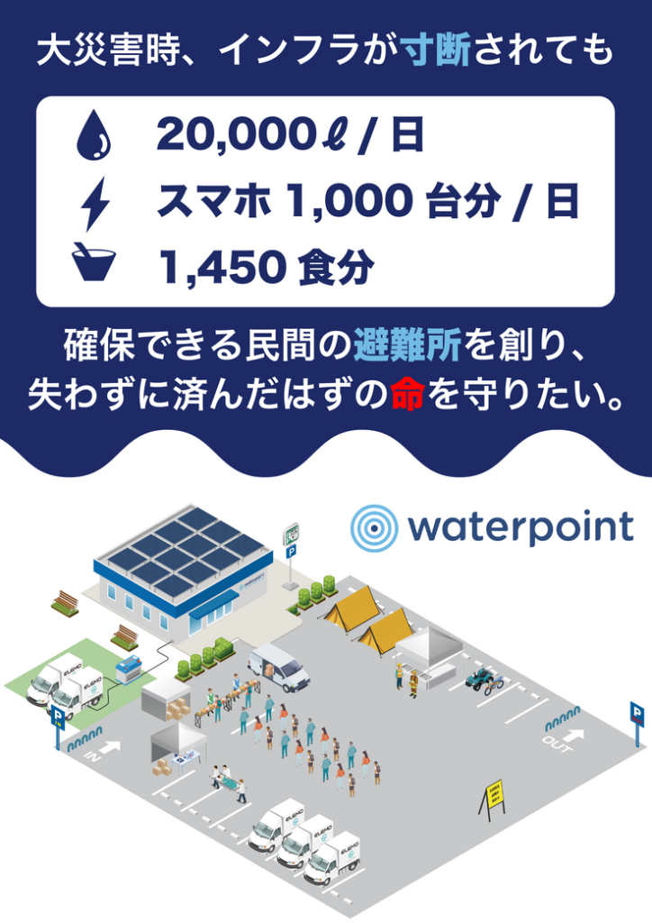 本プロジェクトを通して、災害時には1日に2,000名へ給水でき、避難所としての物資や救援装備を持ち、スマホなどへ給電する機能を備えた「給水特化型の民間緊急避難所」へ生まれ変わります。