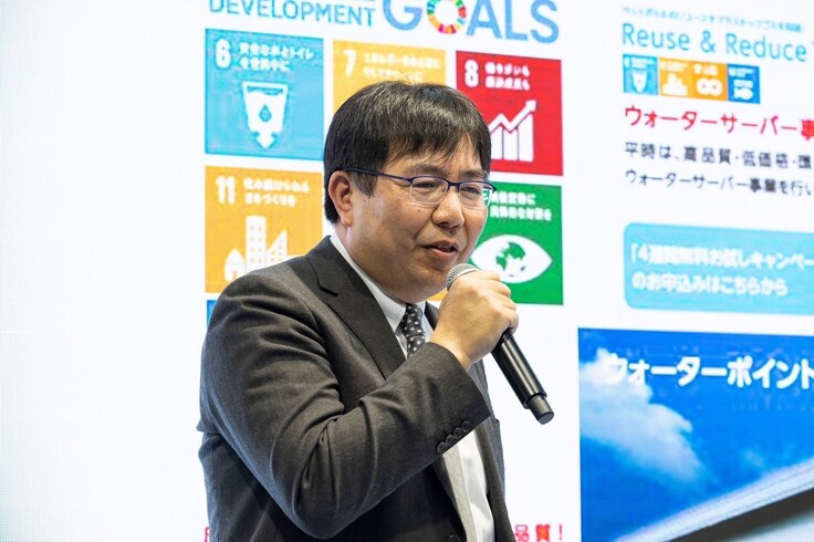 ウォーターポイント株式会社は2022年で創立50周年を迎えました。現在は、逆浸透膜を用いたウォーターサーバーが主力事業の水を扱う会社です。当社は、飲料水を扱う企業でありながら、東日本大震災時に被災者にライフラインである水を提供できなかったという悔しい想いがあります。